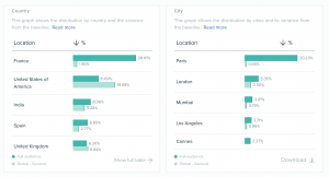 La localización de los usuarios de un hashtag en Twitter se muestra de varias maneras. En primer lugar puede verse una diferenciación entre país y ciudad. La línea verde oscura es siempre nuestro hashtag (la audiencia de nuestro hashtag) y la línea verde clara es la comparativa con lo que hayamos elegido: el mundo, un segmento, etc.