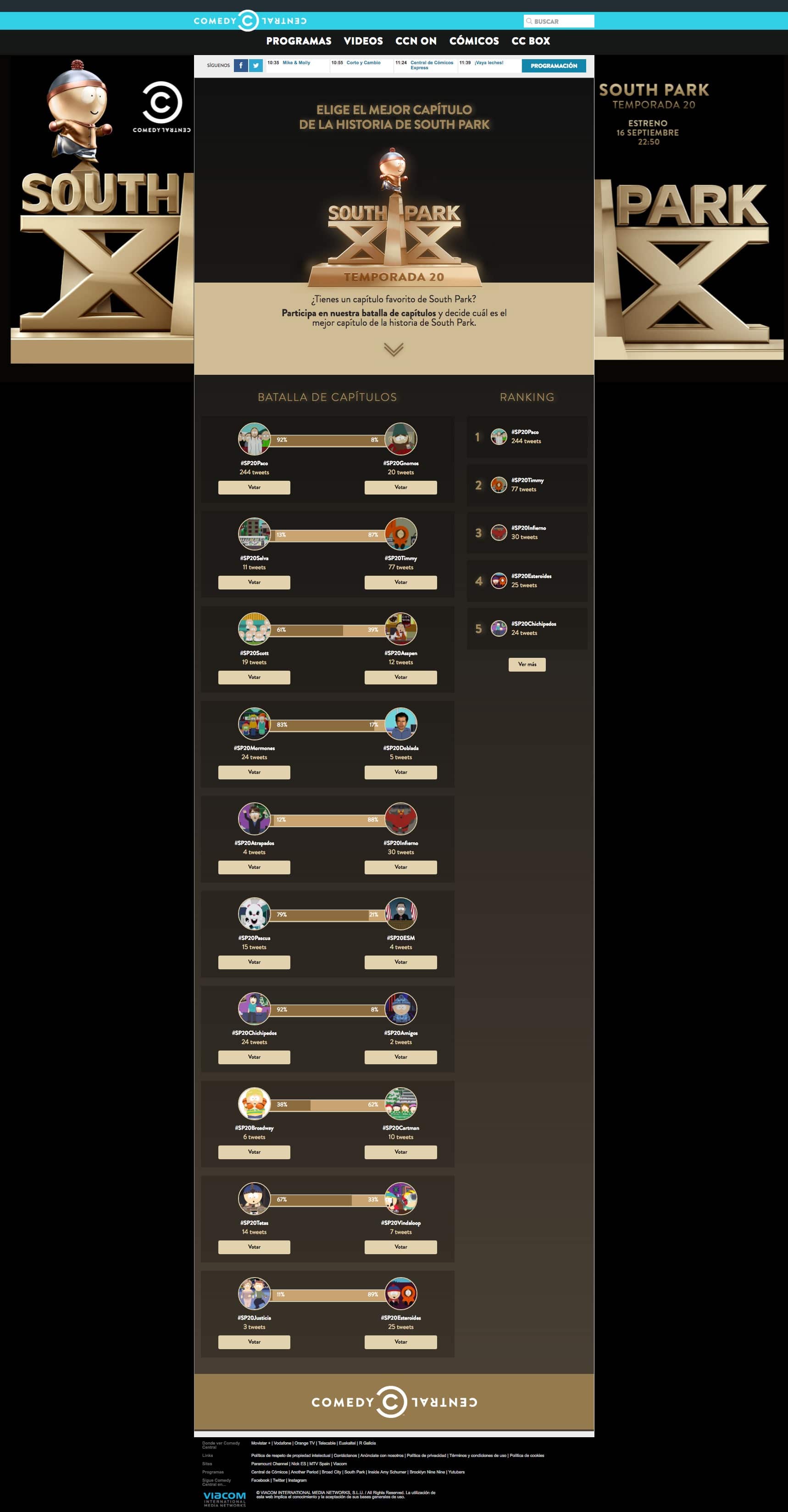 Comedy Central wants to discover the favorite episode asking to the audience. For that, we have created a Ranking of episodes according to the number of tweets. This is a great way of encouraging people to collaborate with the TV show and it is perfect to give huge exposure to it.