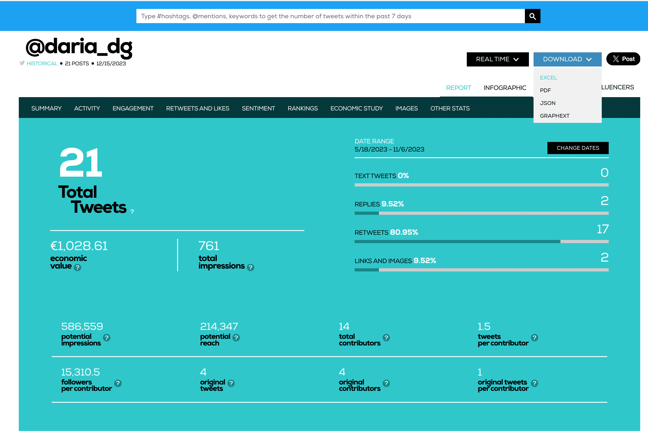 In addition to the stats, an excel report includes all of the tweets with various fields, such as date, username, tweet text, tweet link and more.