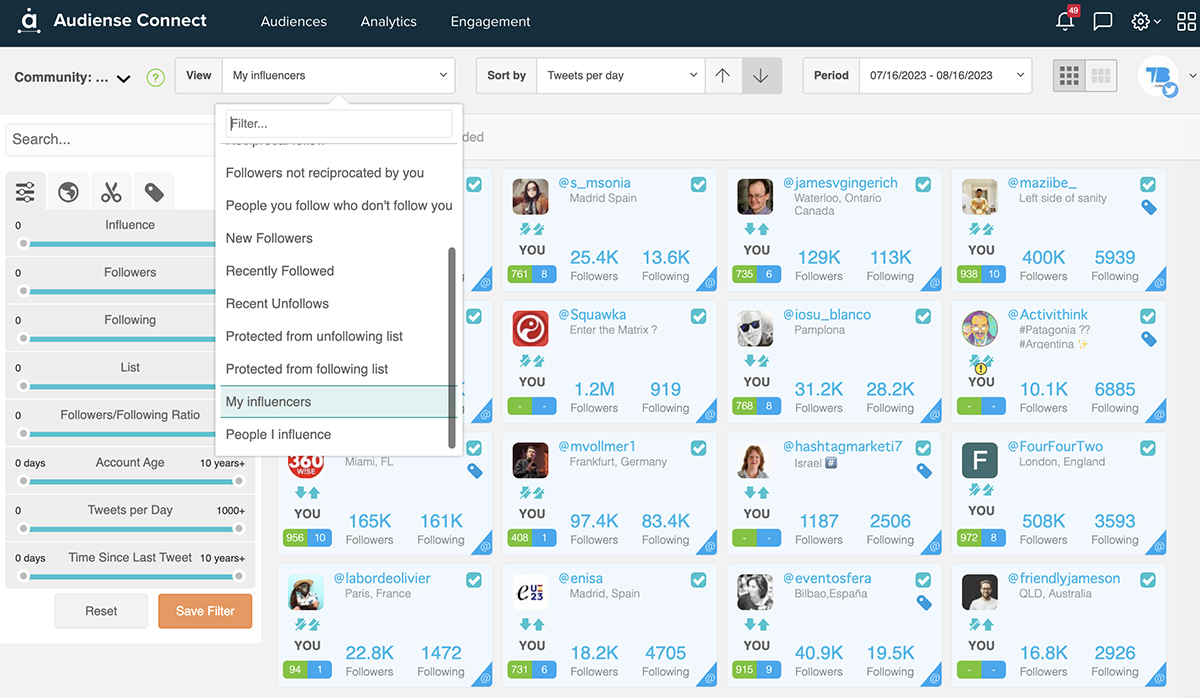 For example, accounts with next to no followers are often fake or spam accounts. With Audiense Connect, you can filter Twitter followers by accounts with 10 or fewer followers.